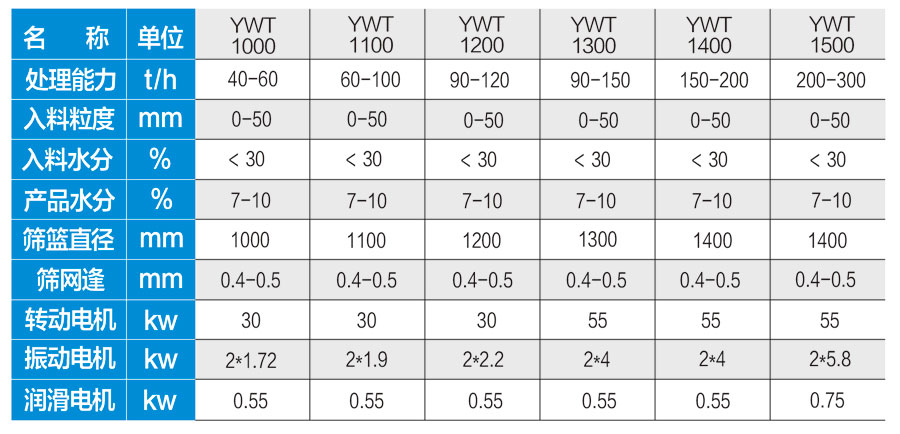 YWT系列臥式振動離心機適用于沫精煤、沫中煤的脫水,入料粒度為0~50mm,入料水分小于30%,產品水分7-10%。隨煤質不同,入料粒度組成不同,離心機的處理能力有很大的不同。一般來說,入料中細顆粒增加,則處理能力降低,產品水分增大。