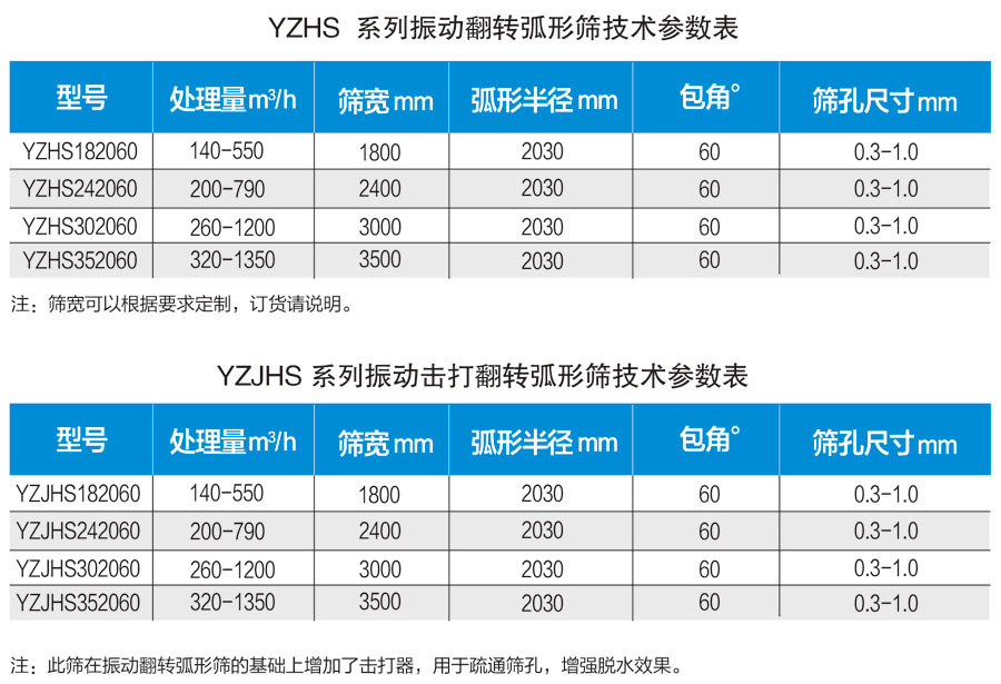 YZ(J)HS系列振動(擊打)翻轉弧形篩是煤炭工業使用的一種細粒級物料脫介、脫水分級設備。按給料方式不同可以分為自流弧形篩和壓力弧形篩:按設備特點可分為固定弧形篩、可翻轉弧形篩、振動翻轉弧形篩、擊打式翻轉弧形篩和振動擊打式翻轉弧形篩等。弧形篩僅做初步脫水,脫介設備必須與其他設備如煤泥離心機、篩分機等配合使用。